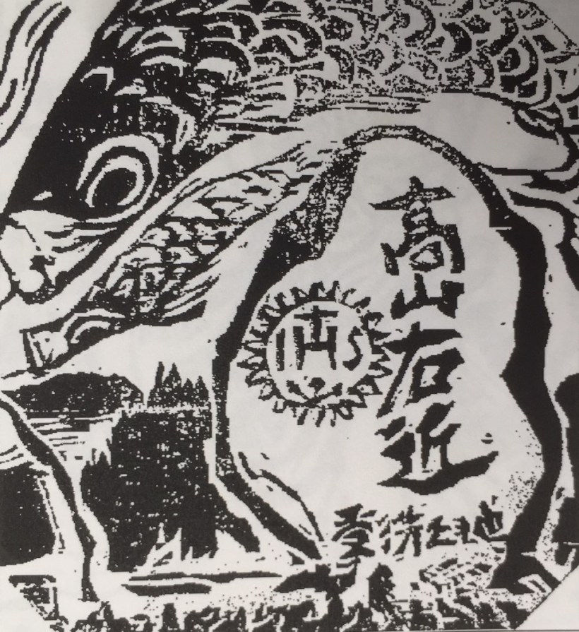 ◘ Memorial-stone of the baptism of Justo Takayama at age 12 (at Sawa Castle in Haibara-cho, Nara Prefecture), with carp-flags in the background as symbols of the children’s feast.