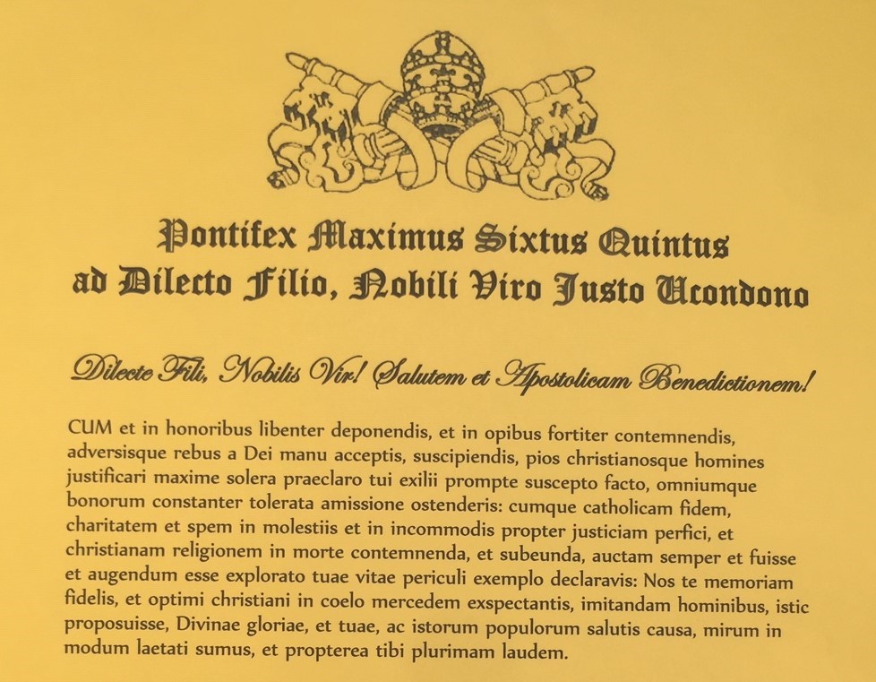 ►1590 — Pope Sixtus V (r. 1585-1590) — Apostolic “Breve” (*photo of present-day print-out) dated April 24, 1590 imparted to Dom Justo Ucondono, when Lord Takayama was stripped of his feudal domain in Akashi Prefecture on June 24, 1587 for refusing to abjure his Christian faith.