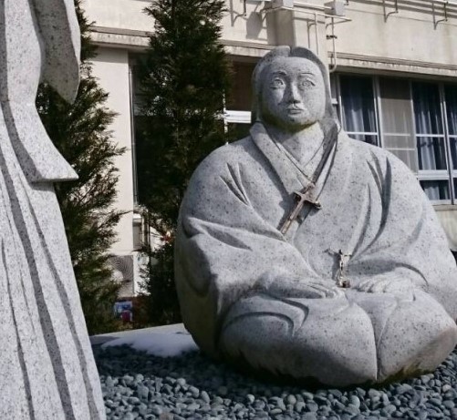 ◘ MARBLE STATUE of the “Kirishitan Samurai” Ukon Takayama — at the plaza fronting the Takatsuki Catholic Church — with a Rosary.