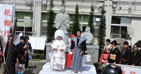 The granite statues of Lord and Lady Takayama form the backdrop for cultural presentations made by Toyono-cho residents.