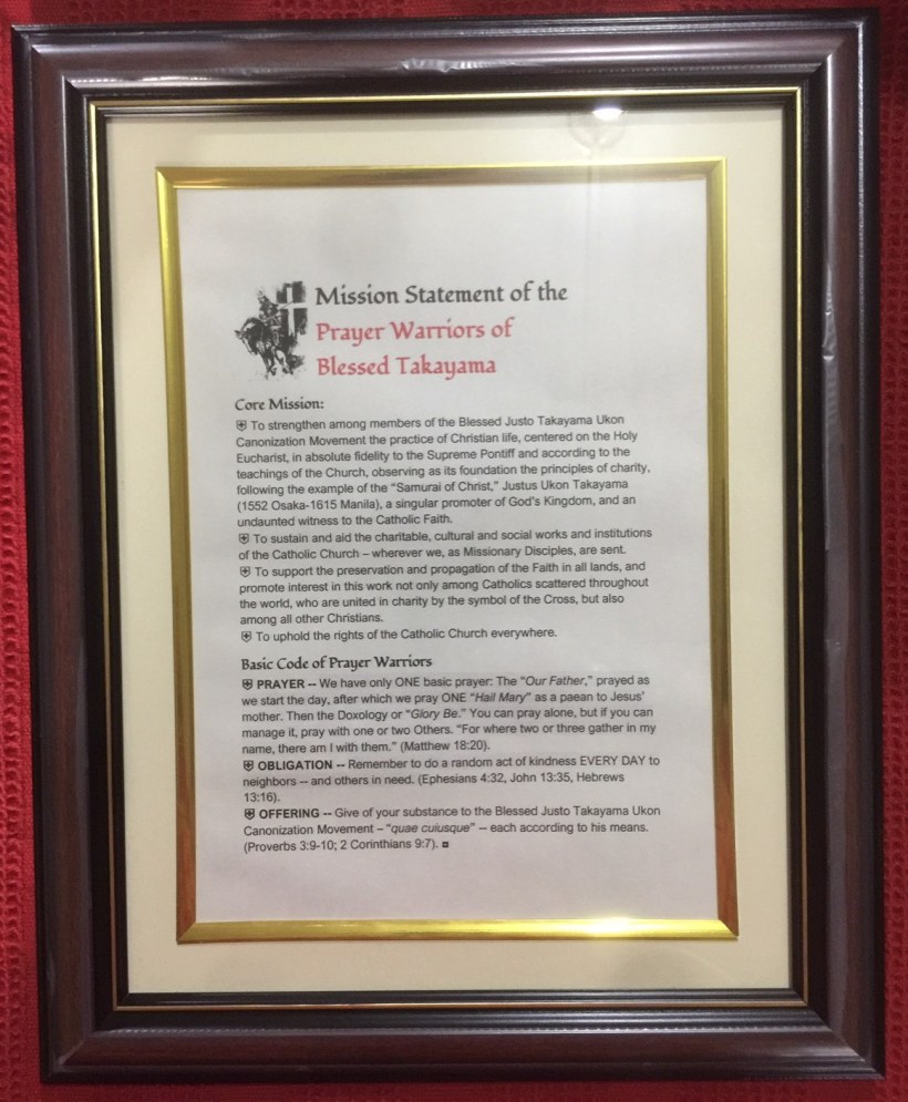 ►As lay promoters of the Cause of Canonization of Blessed Justus Ukon Takayama (1552 Osaka-1615 Manila; beatified 2017), our movement has been blessed by Pope Francis, who has imparted his Apostolic Blessing “to you and all the Prayer Warriors of Blessed Takayama as a pledge of peace and joy in the Lord.” We must remain ardent Missionary Disciples for the New Evangelization — committed to “put Jesus at the heart” of all efforts in New Evangelization. “From both Scripture and Tradition, we can see that the path of the new evangelization has been marked out: we are called to renew the proclamation of Jesus Christ, by virtue of our baptism.”
