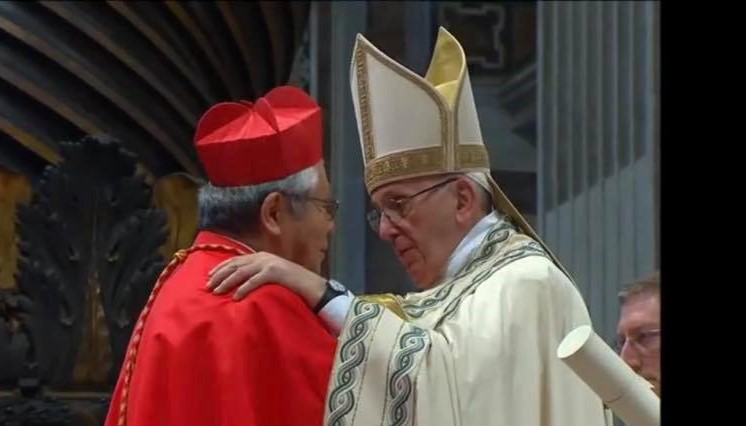 Cardinal Thomas Aquinas Manyo Maeda, in a fraternal embrace with Pope Francis